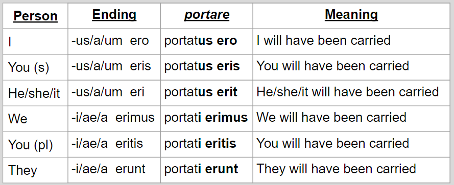 The most important thing to remember is that it has to match the nominative in number and gender, but they're always going to be nominative so luckily there's only a few endings to learn for these. You just need to remember the future tense of the verb “to be” gets added onto the end of the perfect passive participle, that fourth principle part.