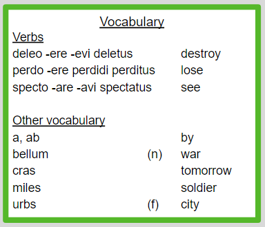 Here are 3 sentences. Have a go at them, and read on when you are ready for the explanations. There’s a vocabulary list in the green box. You might notice that the verb entries are longer than usual. That's because I have given you all four principle parts of the verbs. The fourth principle part is what we're looking at today, the perfect passive participle.