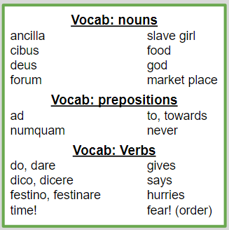 Now I can find a nominative that matches my plural verb - ancillae means “slave girls”, so they’re in charge, and they were hurrying ad forum. So altogether, “the slave girls were hurrying to the forum”.