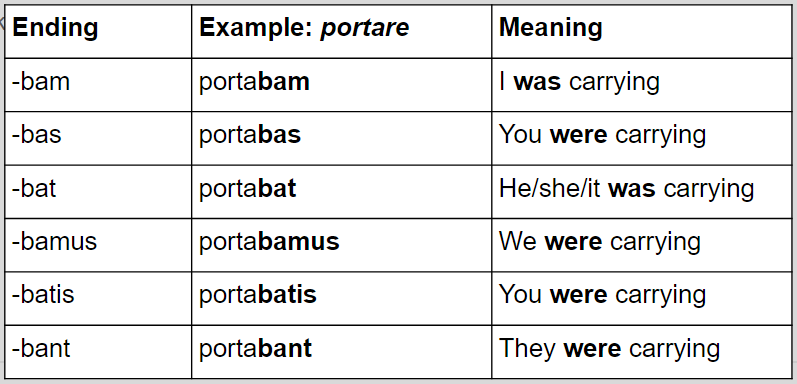 To make the imperfect tense, I take off the -re to get porta, and add my imperfect signifier -ba- to this stem. This -ba- is the bit that tells me it’s an imperfect. Then, I just add the person endings, -m, -s, -t, -mus, -tis, -nt, and that tells me who is doing the verb!