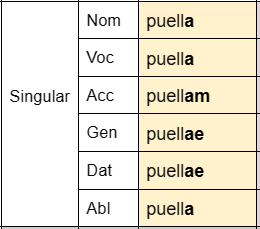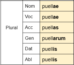 All 1st declension nouns follow this pattern of endings, and they stay the same in the stem, so they're easy to spot. You know what that root word puell- means: “girl”.