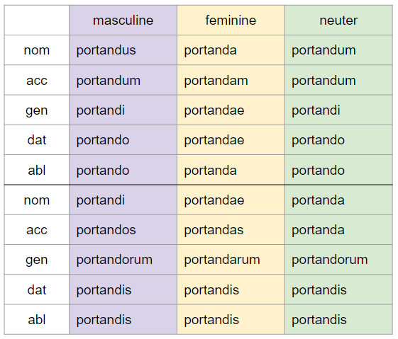 Let's take an example. porto, the verb to carry, in the gerundive goes: