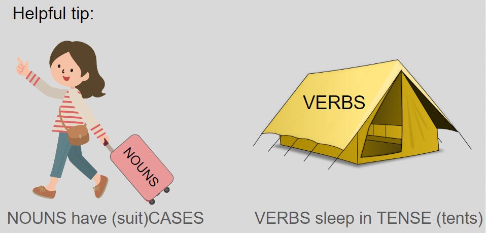 Nouns have (suit)cases. Verbs sleep in tents (tense).