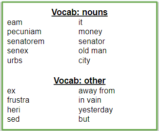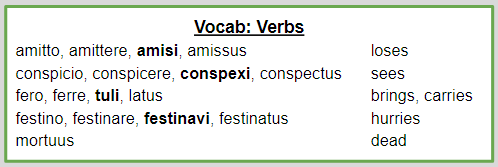 The vocab is below the sentences, and is split into categories. I have given the principal parts for verbs (be careful, some of the verbs are very irregular). The perfect stems you are looking for, that third principal part, are in bold.
