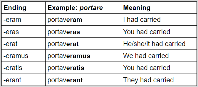 Take the perfect stem, portavi. Take off the -i (which is the perfect ending) and add the pluperfect endings on.