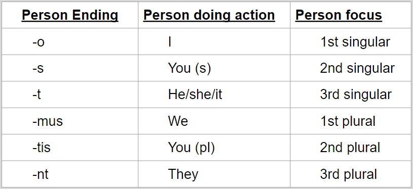 I’ve said it before and I’ll say it again, the endings of Latin words are the most important part! They tell you all the information you need to know in a sentence. So you need to know the person endings for the present tense, as all other tenses stem from this. There are patterns throughout them all.