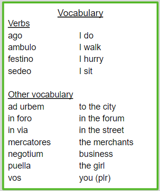 In Latin sentences the verb is usually at the end of a sentence or clause. As usual, I have the vocabulary below in the green box. In the vocab, you might notice all the verbs are glossed in the 1st person singular - the “I am doing it” form. This is how you will see verbs in a dictionary, so get used to that!