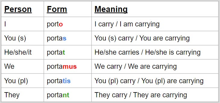 I end up with a table that looks like this - the present tense of portare (to carry)