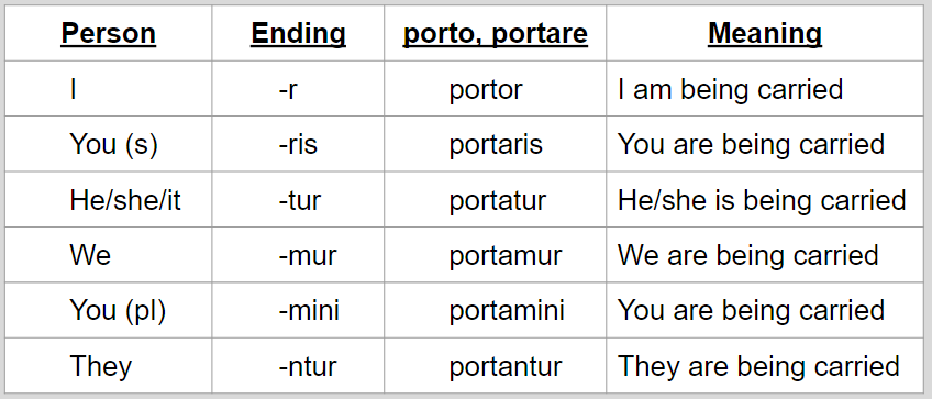 Note: with these passive verbs you're often going to get what's called an ablative of agent. I will do a post on those in the future, but don't worry about them for now. They're indicated by a or ab, which means by.